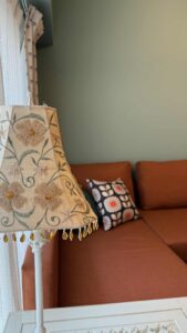 玉ねぎ柄のような可愛らしいレトロクロスが、空間のアクセントになっています。