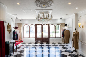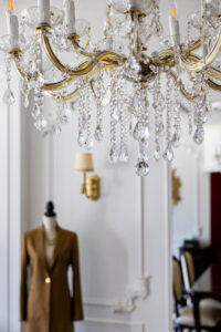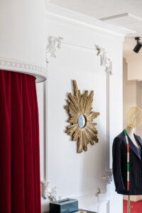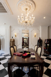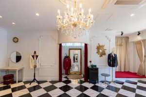 仕上がった新店舗は、細部まで美意識が貫かれた空間です。舞台の幕を思わせる深紅のカーテン、クラシカルなモールディング、透明感あふれるシャンデリア…。