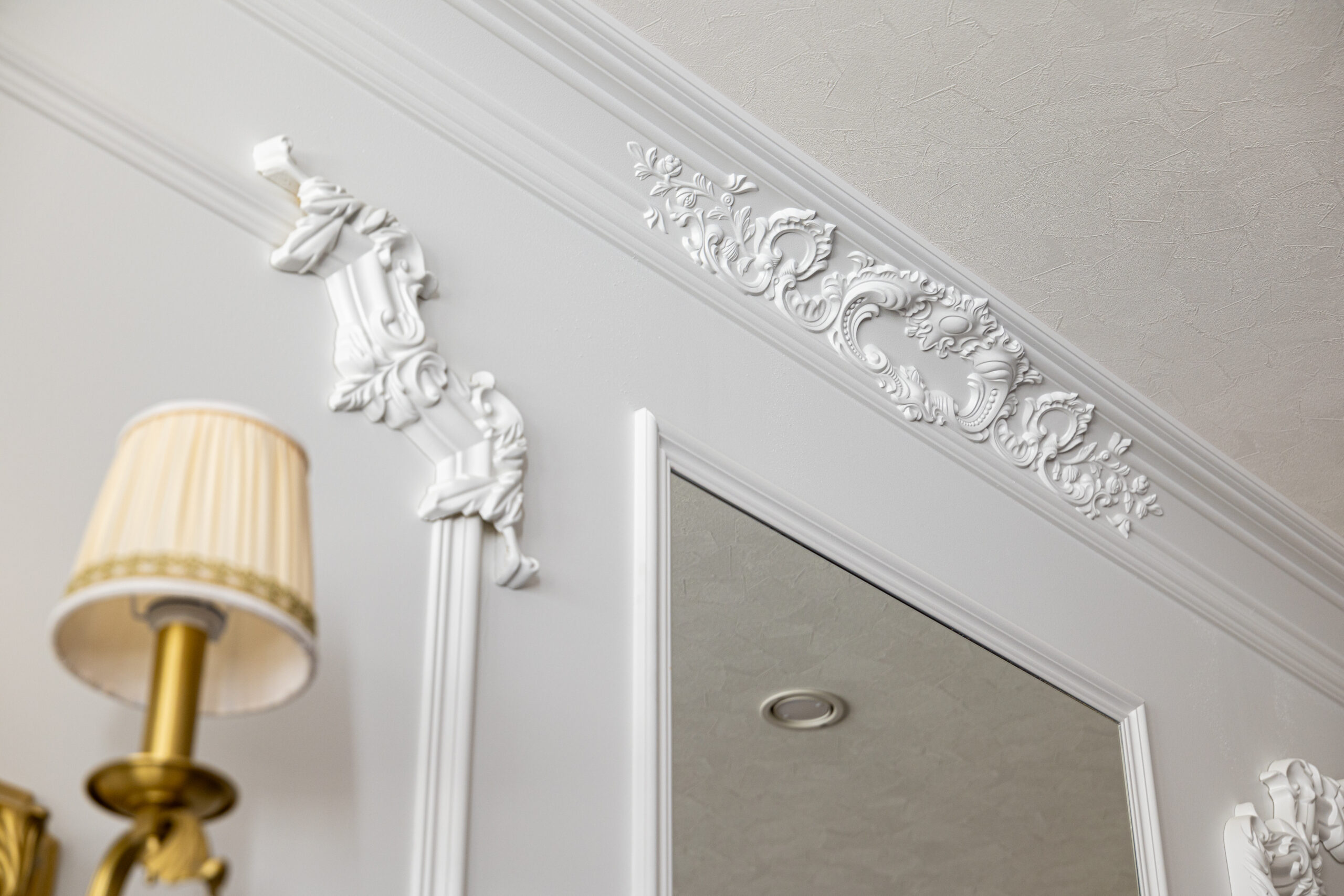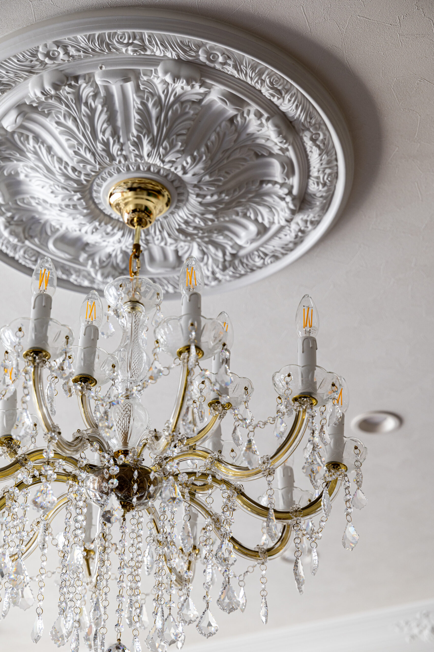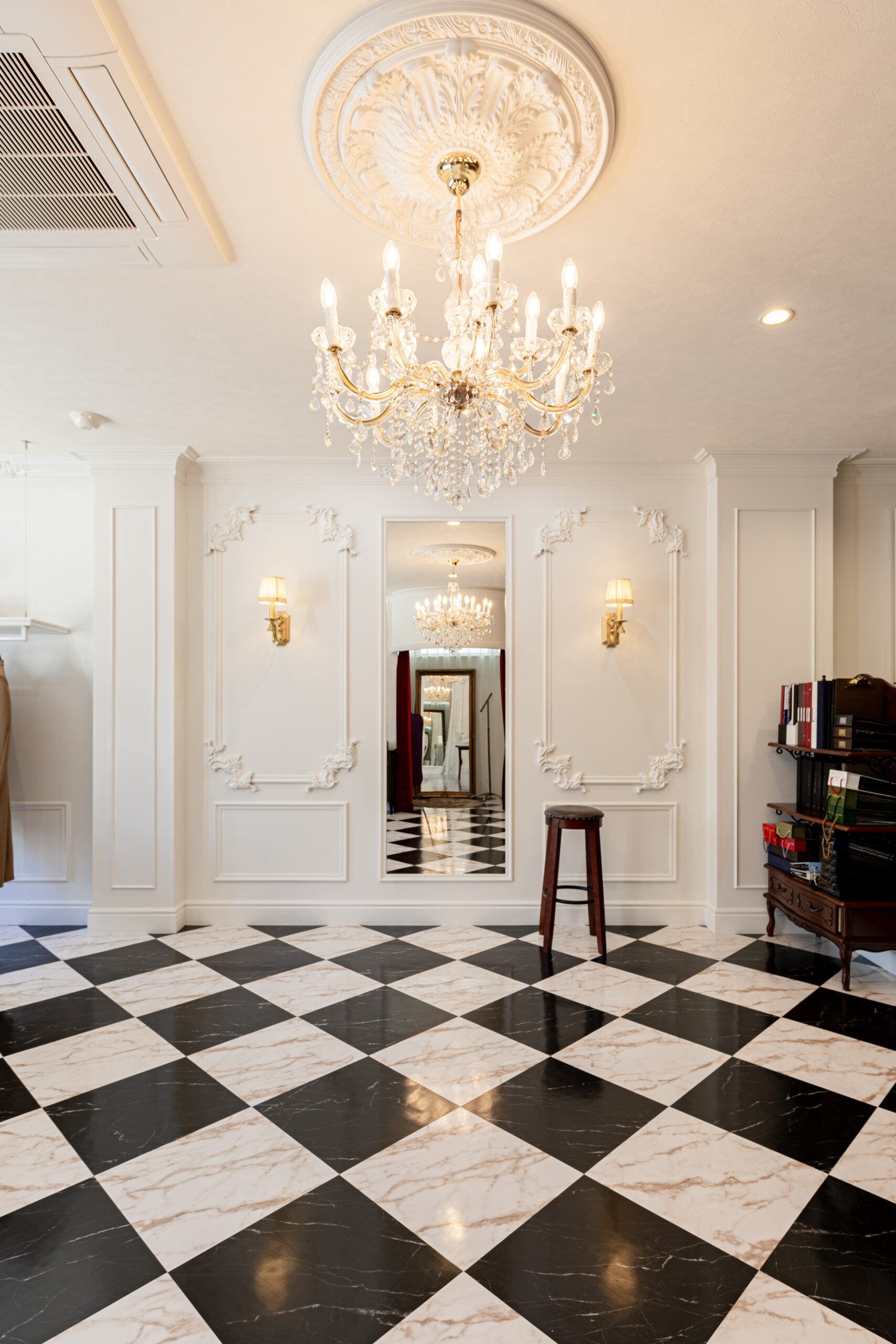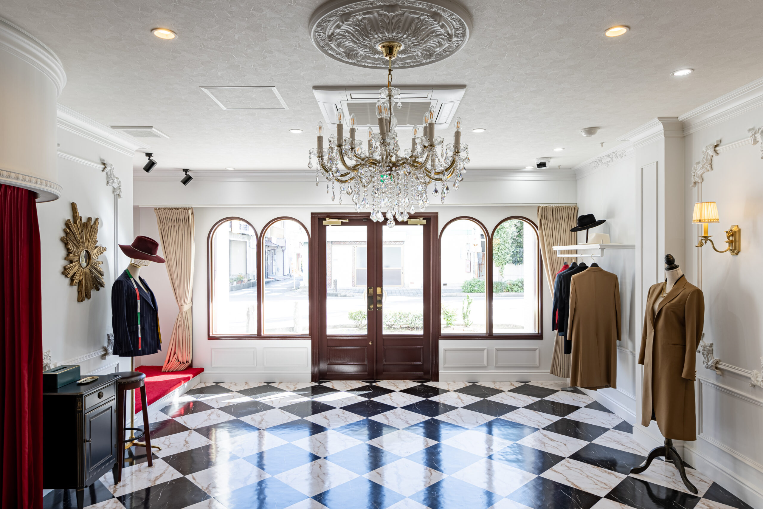 仕上がった新店舗は、細部まで美意識が貫かれた空間です。舞台の幕を思わせる深紅のカーテン、クラシカルなモールディング、透明感あふれるシャンデリア…。