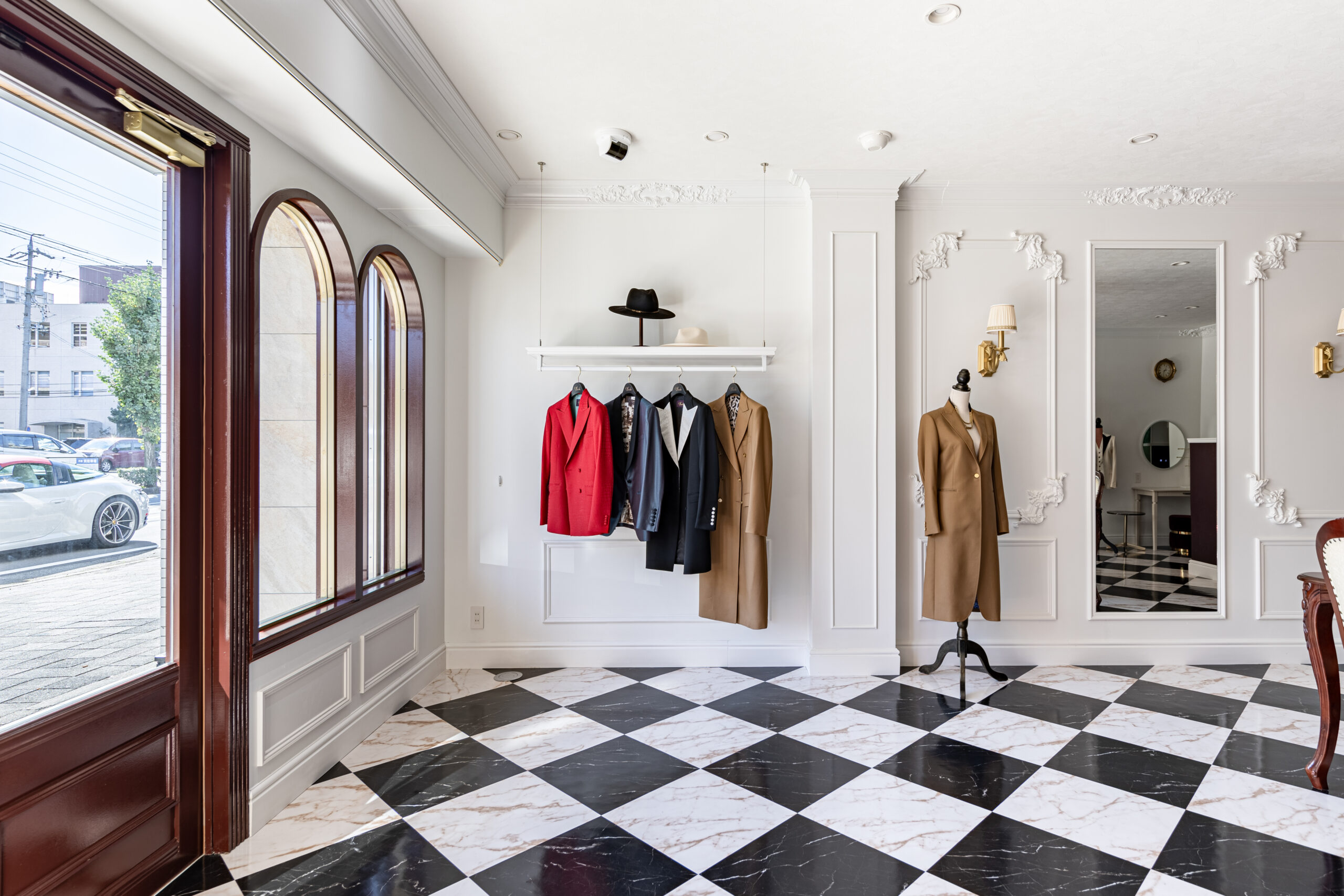 お客様はモデル経験を活かした卓越したセンスで、尾州産の中でも特に希少な高級生地を厳選し、国内屈指の工房と連携して “本当に良いものを求める女性” のためのスーツを仕立てています。その唯一無二の世界観を、今回の新店舗にも余すことなく表現するため、プラン確定までは何度も打ち合わせを重ねました。